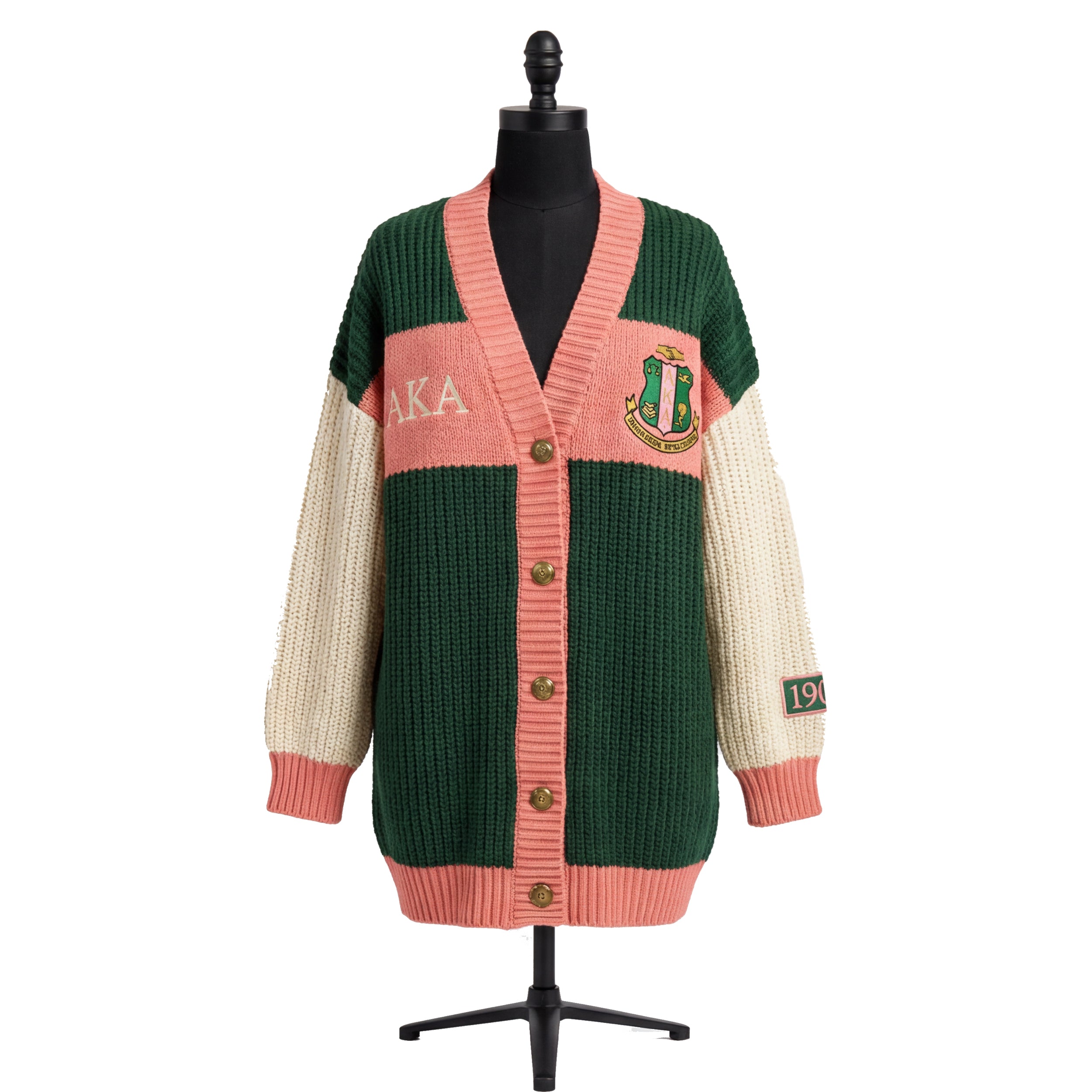 Cozy meets iconic in this Alpha Kappa Alpha Color Block Knit Cardigan, the perfect sorority layering piece for every Ivy woman who wants to stay warm and rep her Pink and Green in style. Featuring a chunky oversized knit construction in green, pink, and cream, this long cardigan is a luxurious statement piece that works beautifully for campus days, chapter events, or casual everyday wear.