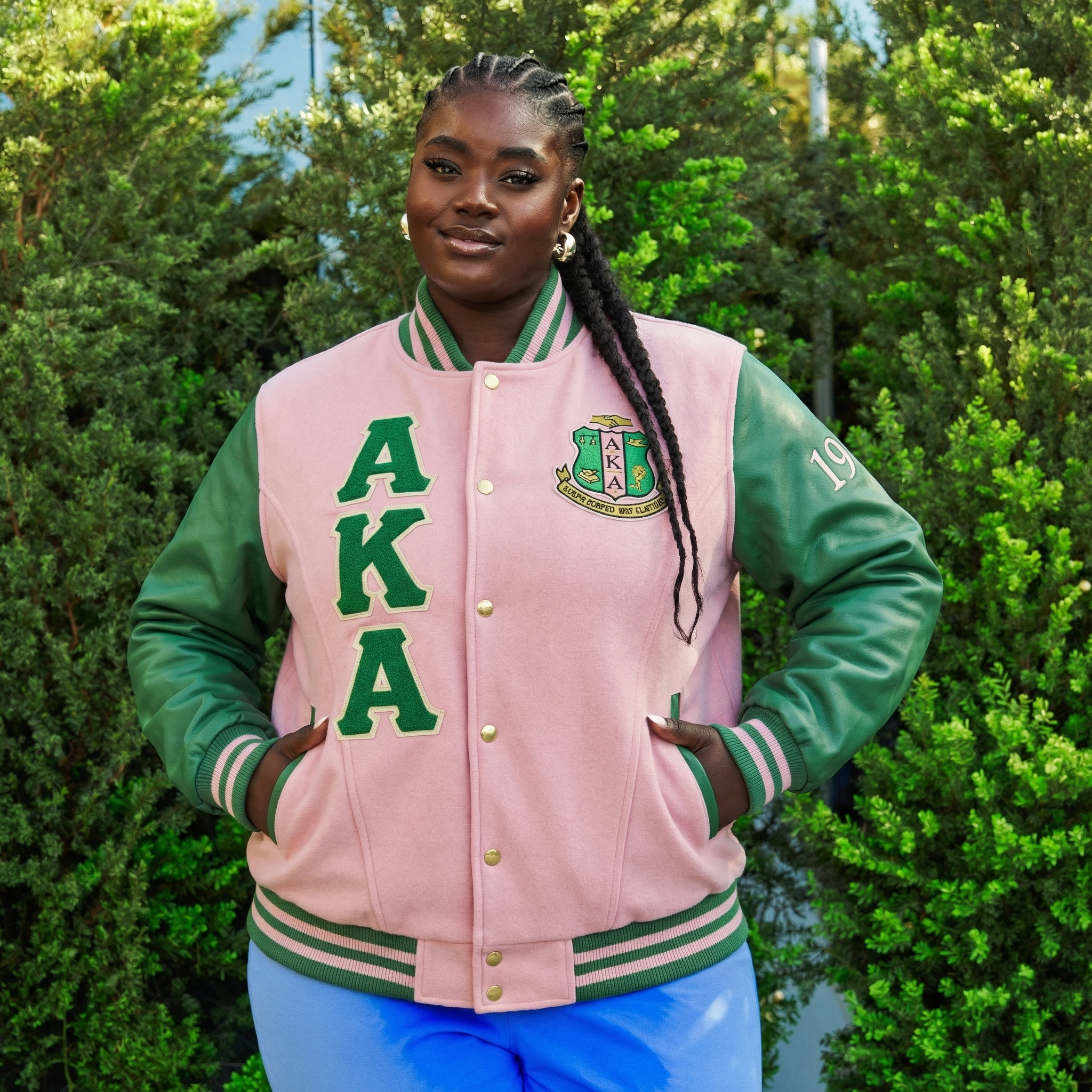 The original. The one every Soror recognizes. This Alpha Kappa Alpha varsity letterman jacket is the most iconic silhouette in Greek outerwear — a premium pink wool/melton body with genuine green leather sleeves, built in the tradition of the classic American letterman jacket and reimagined entirely for the world's first Black Greek-lettered sorority.