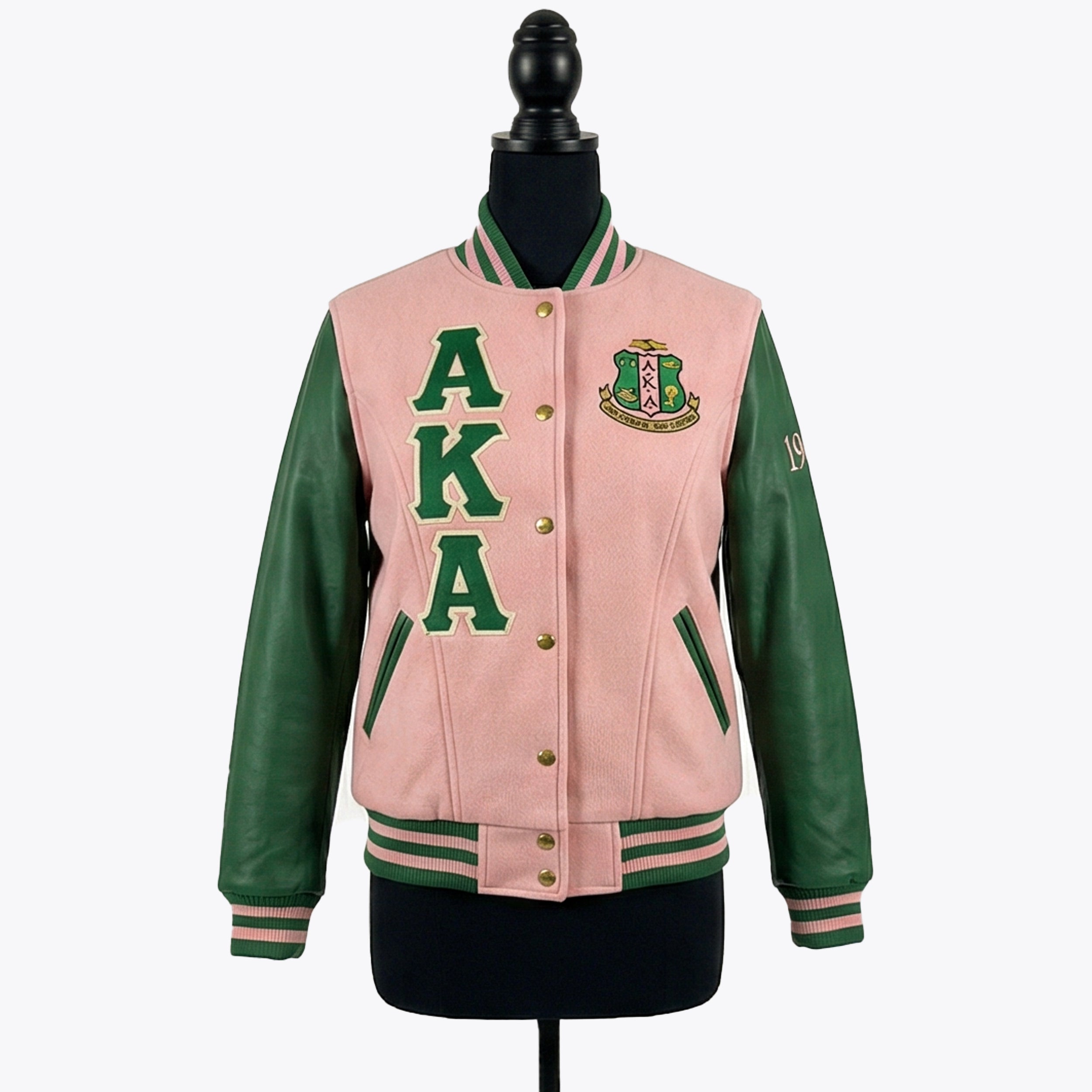 AKA Sorority Varsity Letterman Jacket – Alpha Kappa Alpha Pink Wool & Green Leather with Script Back (1908)