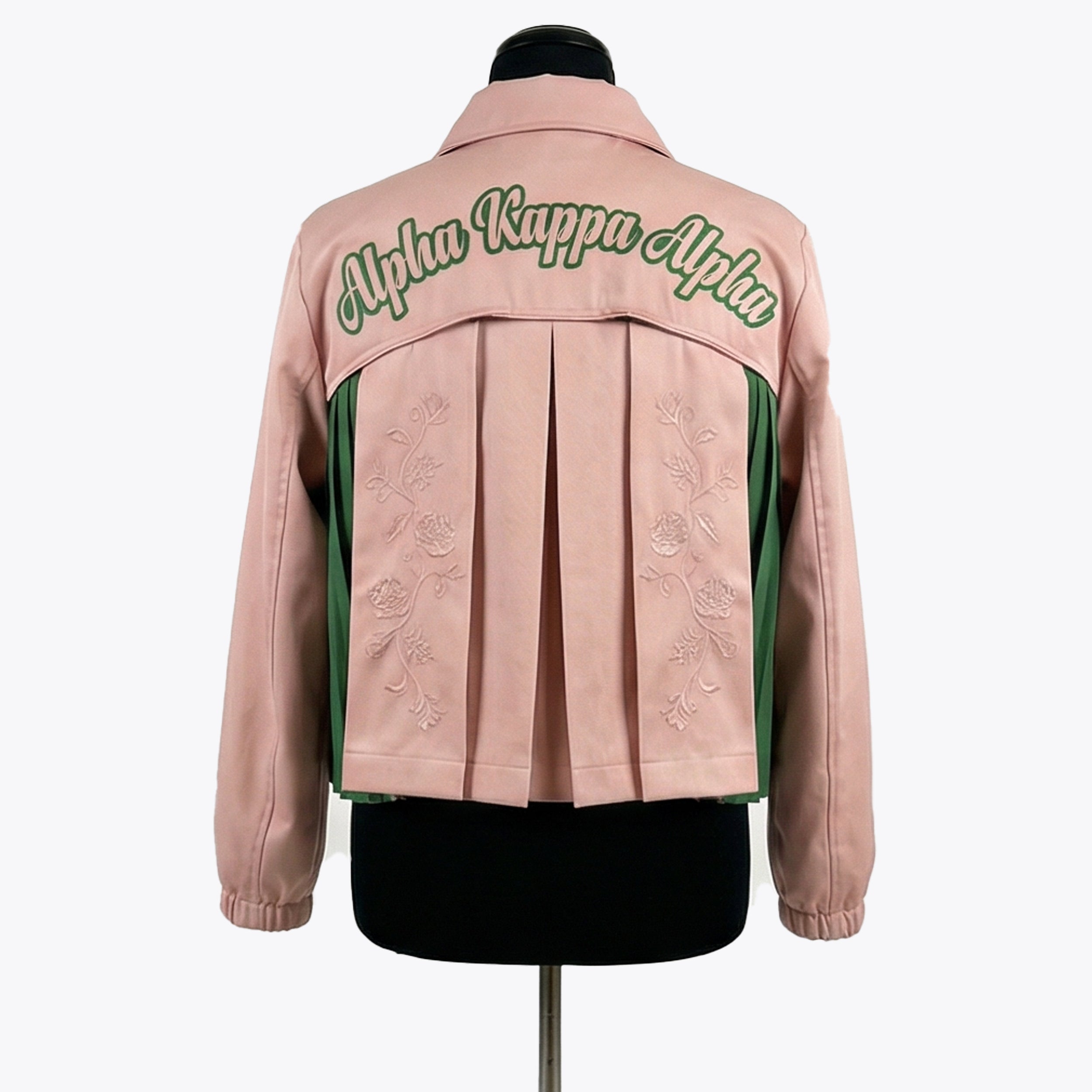The back is the masterpiece of restraint: "Alpha Kappa Alpha" arches across the upper back in full green cursive script — the only piece in the collection to spell out the sorority name in this flowing, feminine typography. Below it, a center pleated pink panel features tone-on-tone floral embroidery — roses and stems pressed into the same blush pink fabric, visible only in the light, like a watermark of sisterhood. Green accordion-pleated side panels flank the center panel, creating a structured, almost architectural back silhouette.