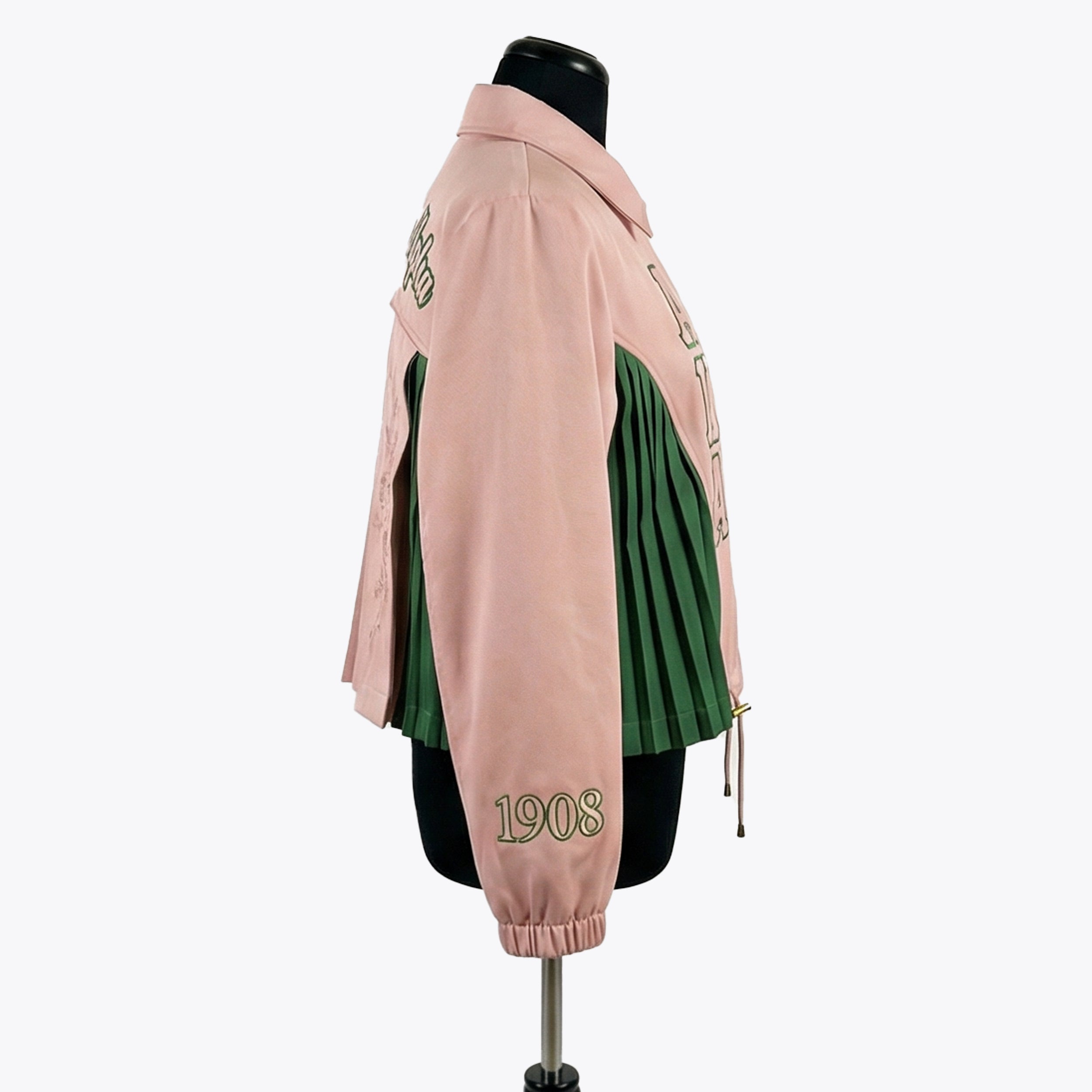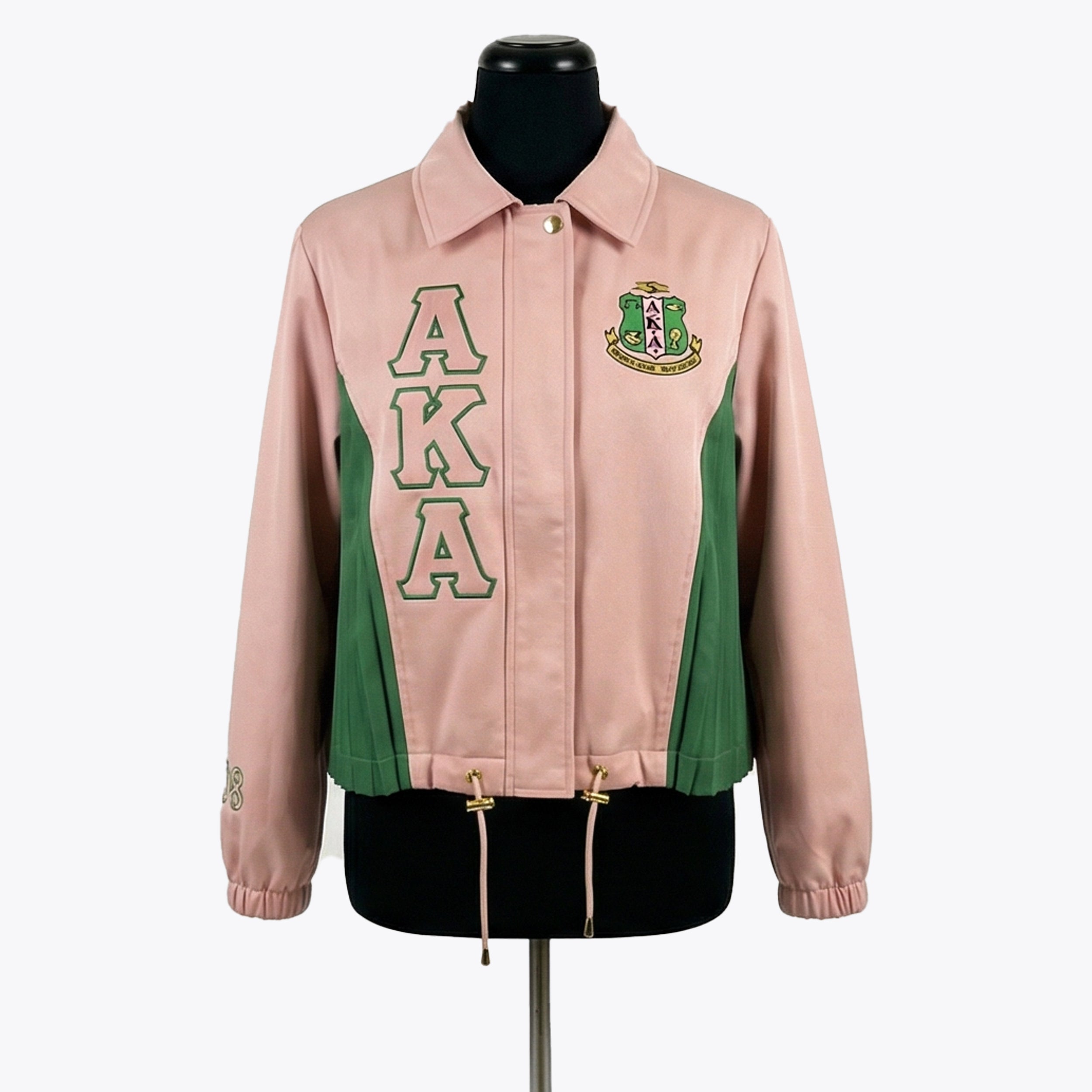 AKA Sorority Coach Jacket – Alpha Kappa Alpha Pink & Green Pleated Script Jacket with Floral Embroidery and Gold Hardware (1908)