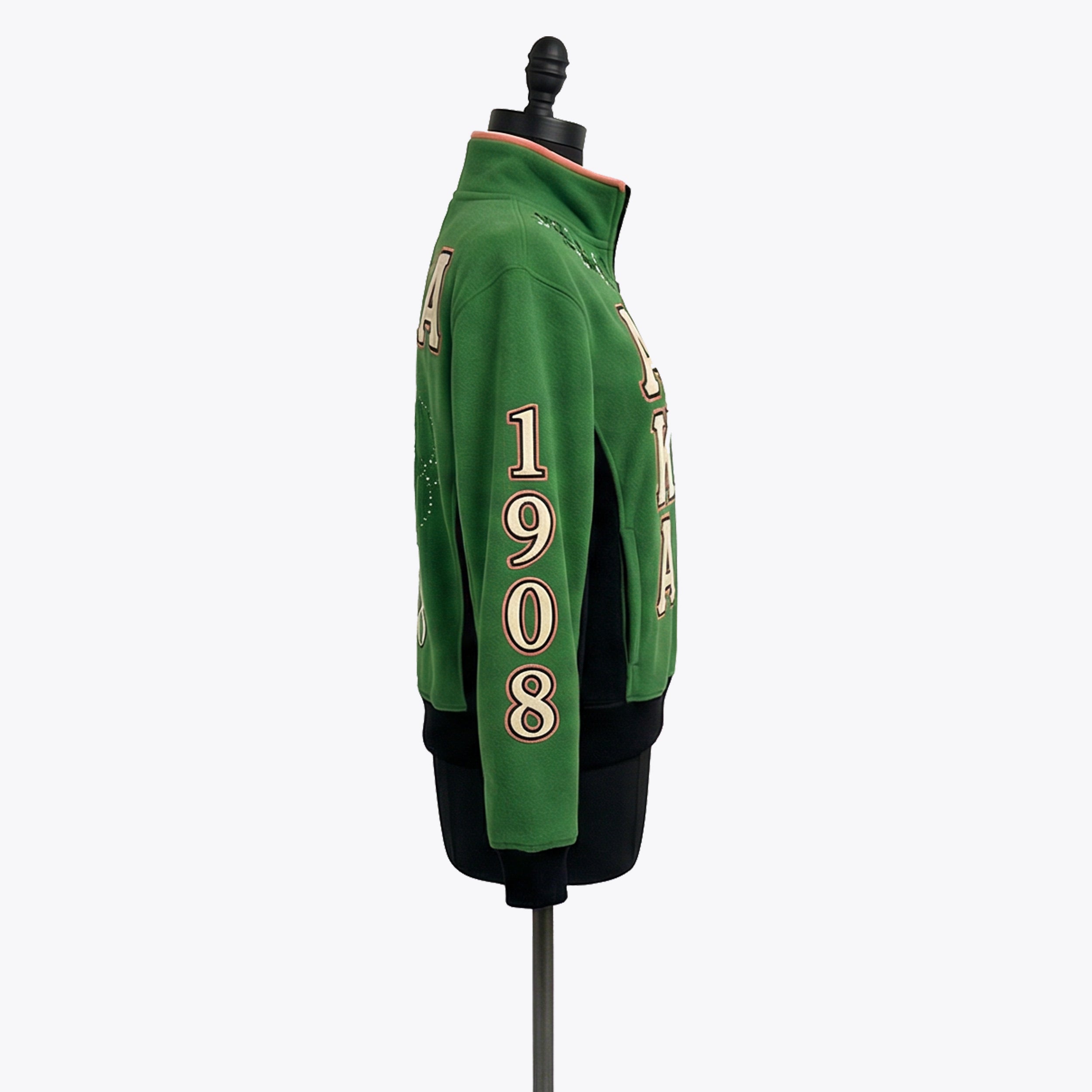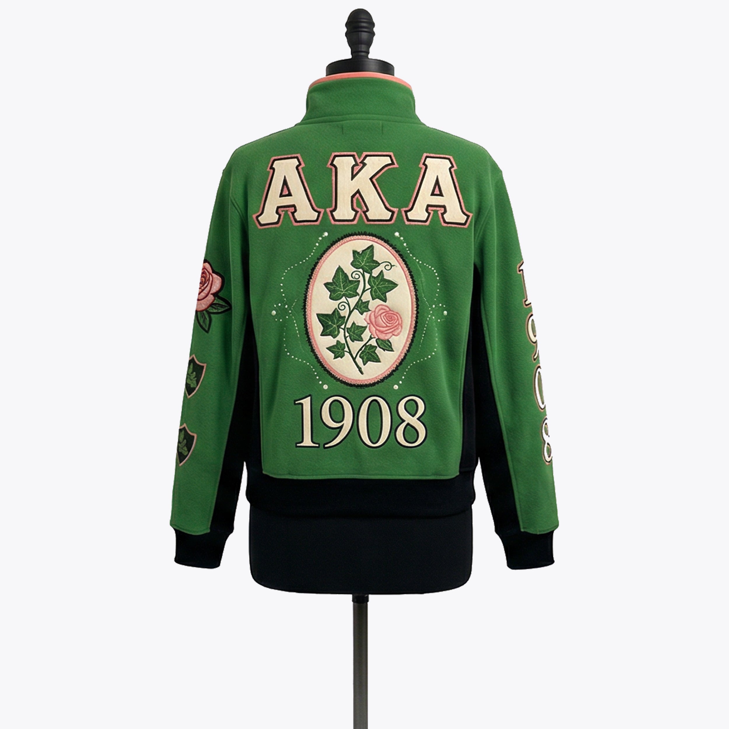 Built on a rich AKA green body with black contrast side panels, this quarter-zip opens to reveal a blush pink inner collar lining — a soft, intentional detail that keeps the sorority's signature colors close. An ivy vine with pearl bead embroidery drapes gracefully across both sides of the chest, framing the zipper like a garland of legacy. Diagonal AKA appliqué letters in cream with a warm outline sit front and center, accompanied by the official Alpha Kappa Alpha shield crest. The left sleeve carries vertical "1908" founding year lettering, while the right sleeve features a large embroidered pink rose with green leaves and an ivy shield patch below — fully loaded from shoulder to cuff.