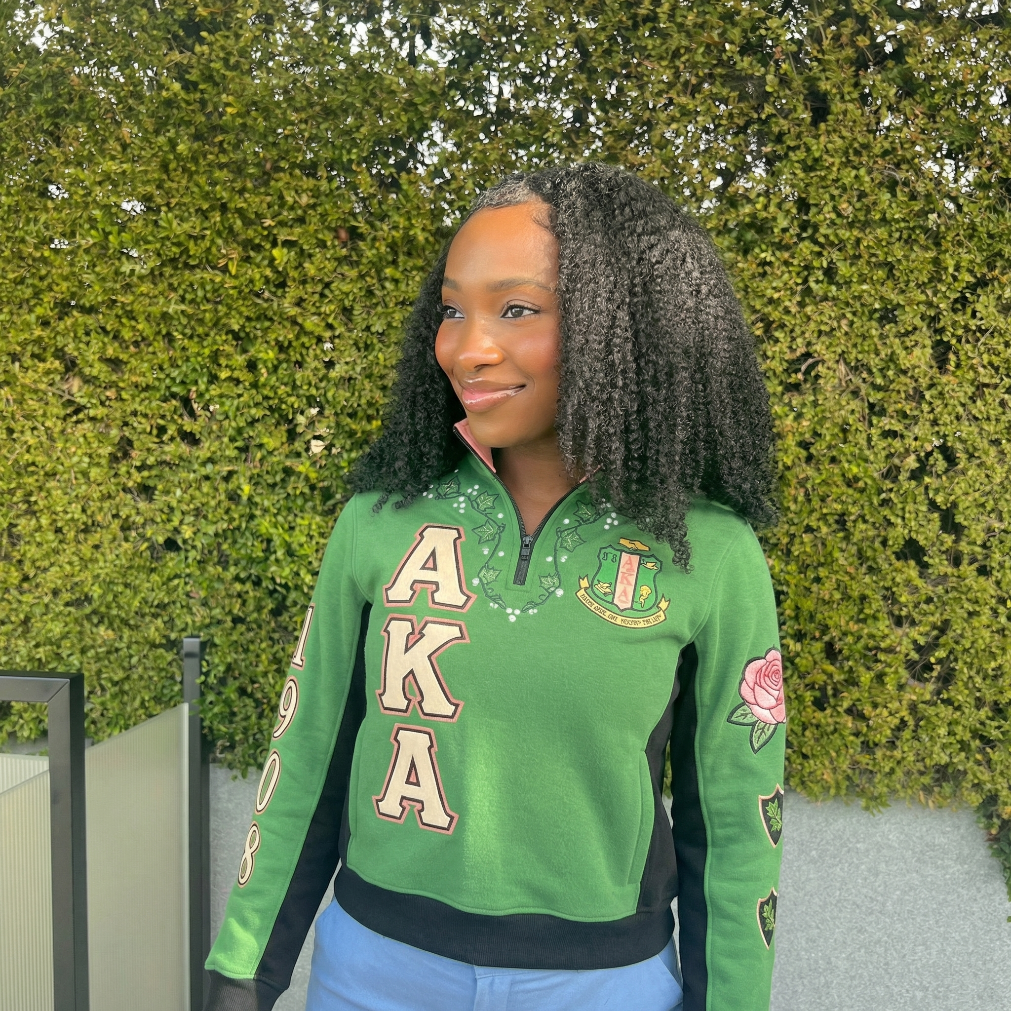 AKA Sorority Quarter-Zip Pullover – Alpha Kappa Alpha Green & Black with Ivy Pearl Drape (1908)