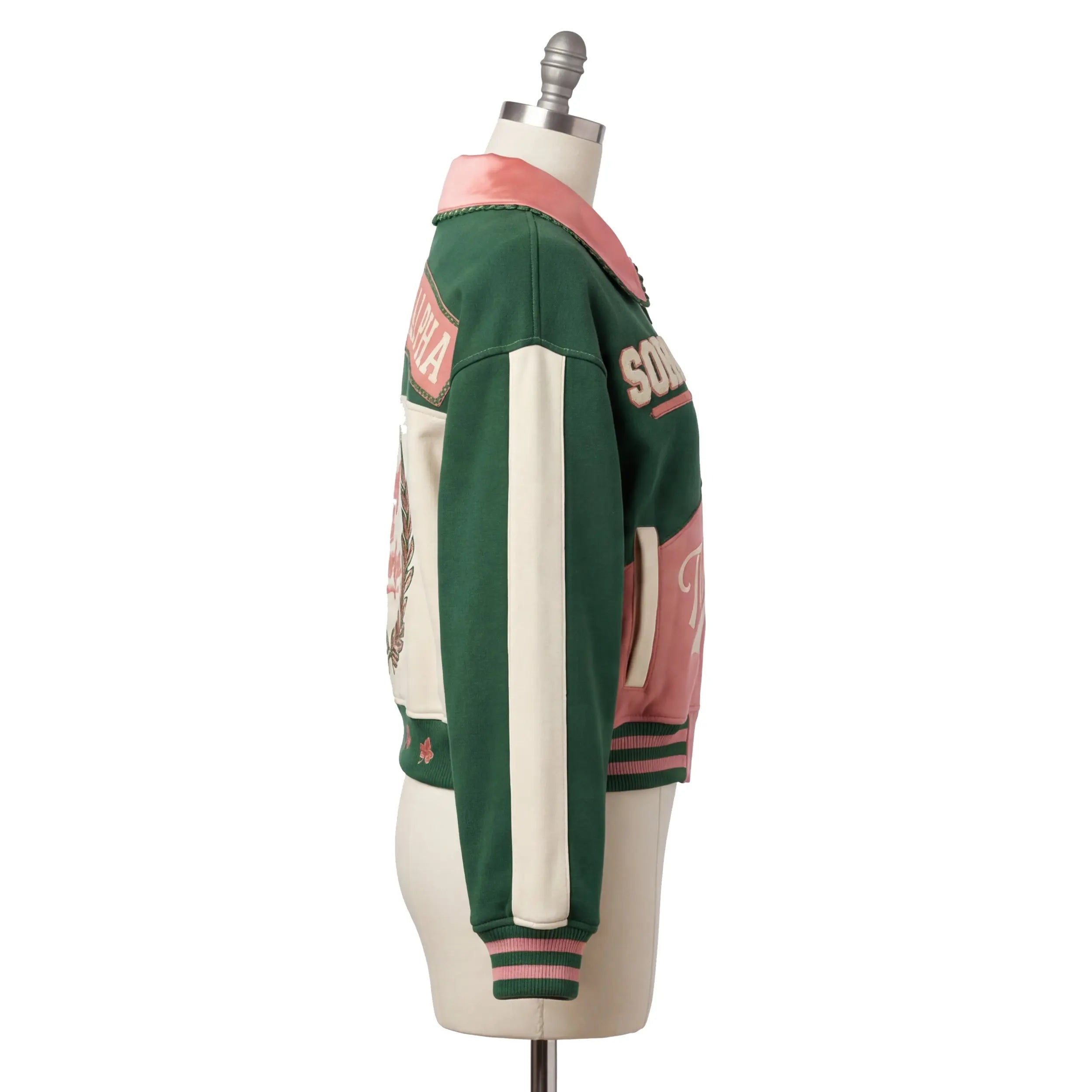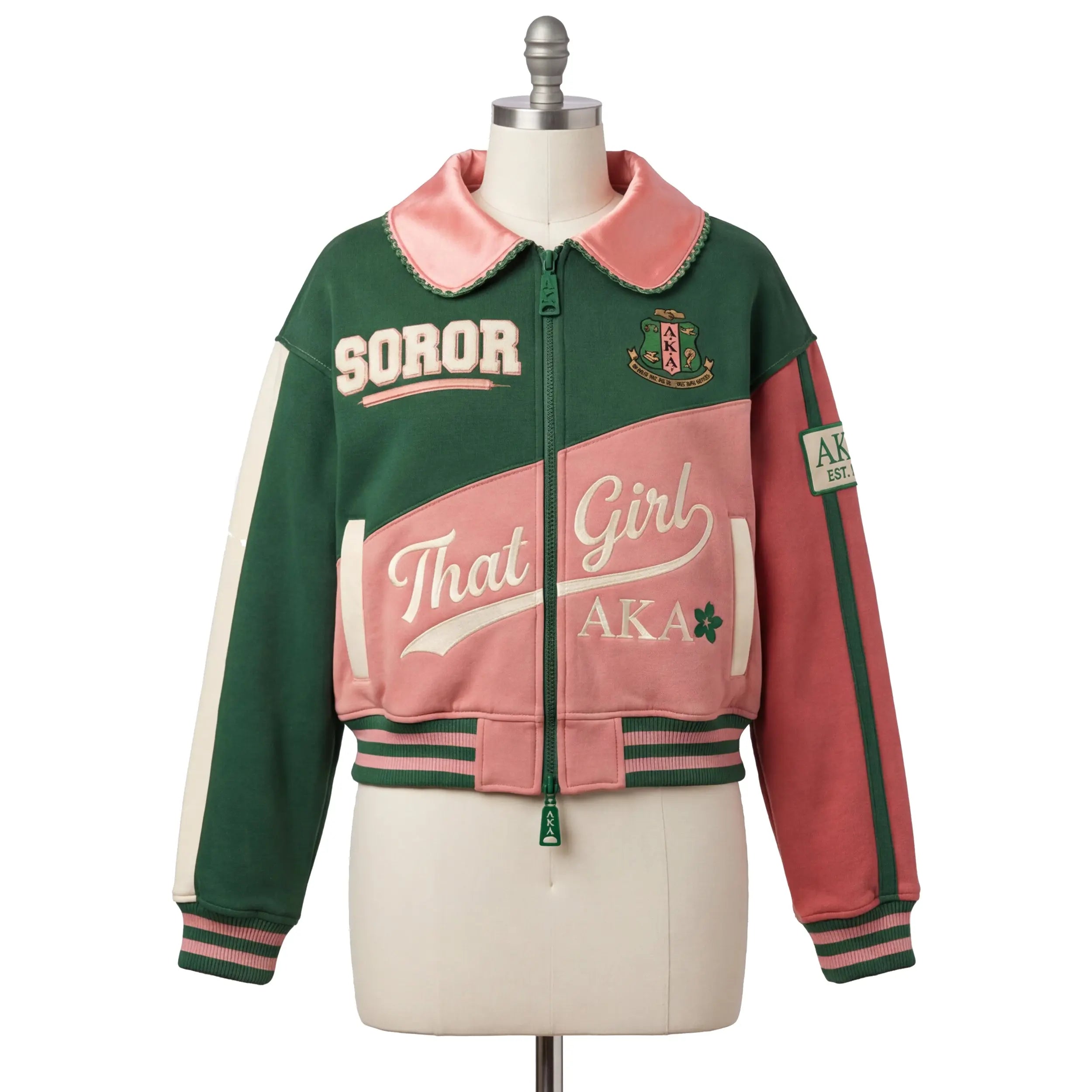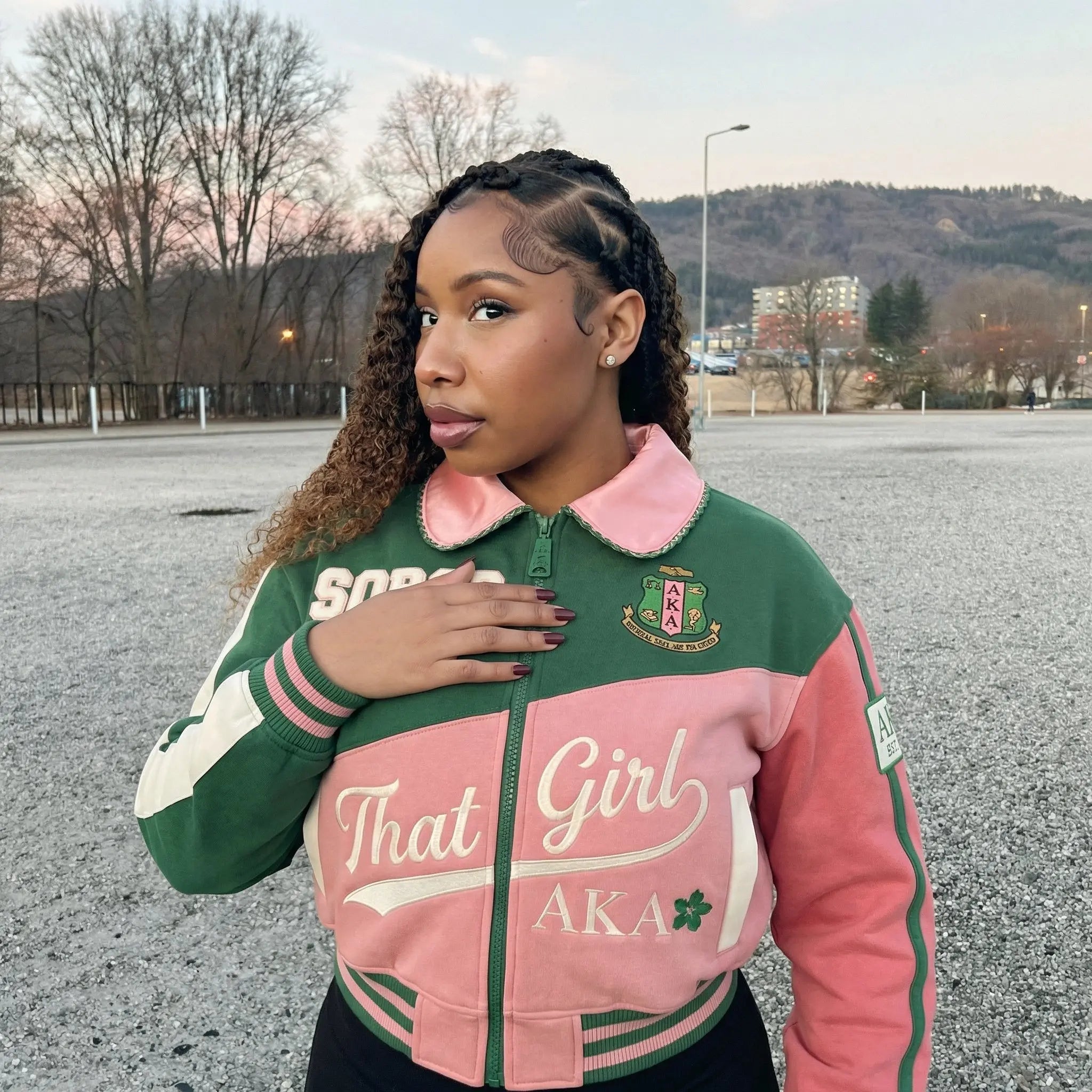 She is Pretty, Powerful, and undeniably That Girl. This Alpha Kappa Alpha That Girl AKA Color Block Bomber Jacket is the ultimate sorority statement piece built for every Ivy woman who moves with purpose and style. Featuring a stunning pink, green, and cream color block design with rich embroidery details from front to back, this jacket is as bold as the woman wearing it.