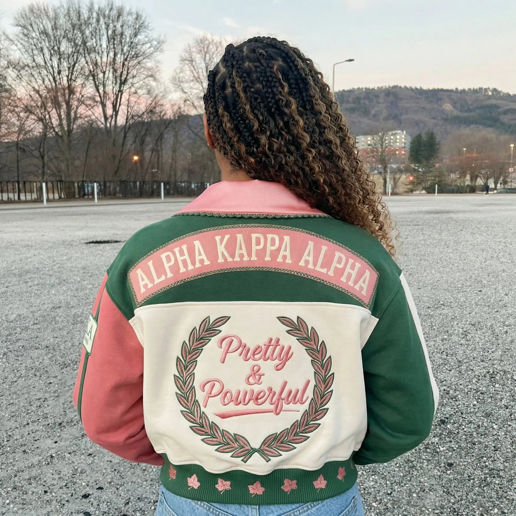 • "ALPHA KAPPA ALPHA" embroidered banner across the upper back in pink on green