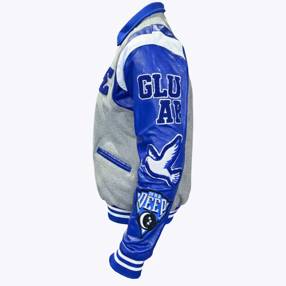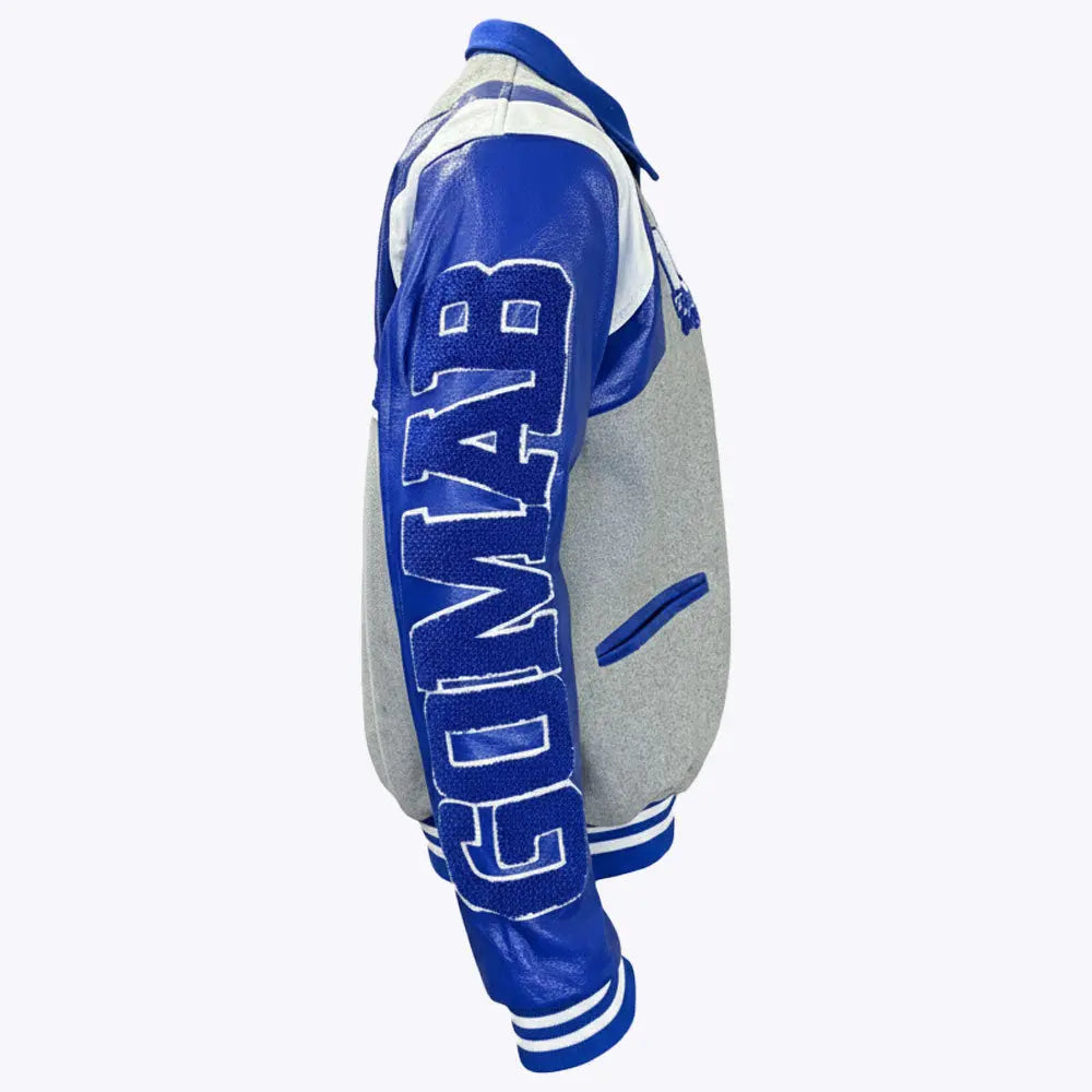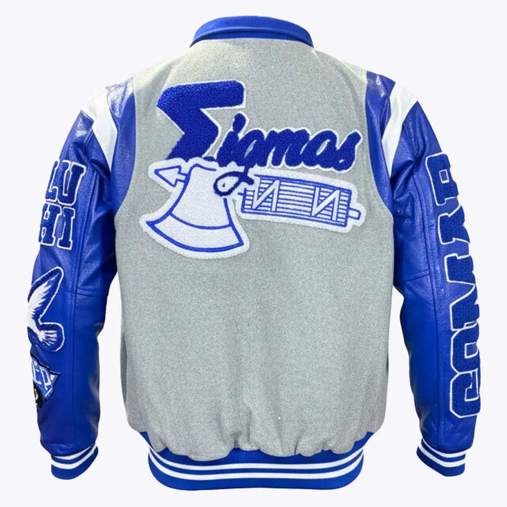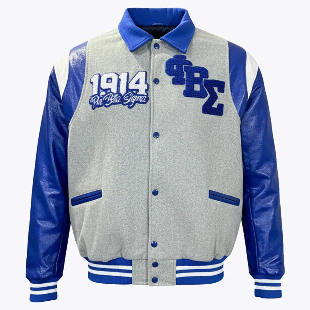 Designed with a heather gray wool-blend body and royal blue leather sleeves, this jacket delivers weight, structure, and contrast. The front showcases oversized chenille Greek letters and a stitched “1914 Phi Beta Sigma” design. Detailed sleeve patches add depth and highlight fraternity heritage. Ribbed striped collar, cuffs, and waistband provide a secure athletic fit, while the snap-button front keeps the look traditional.