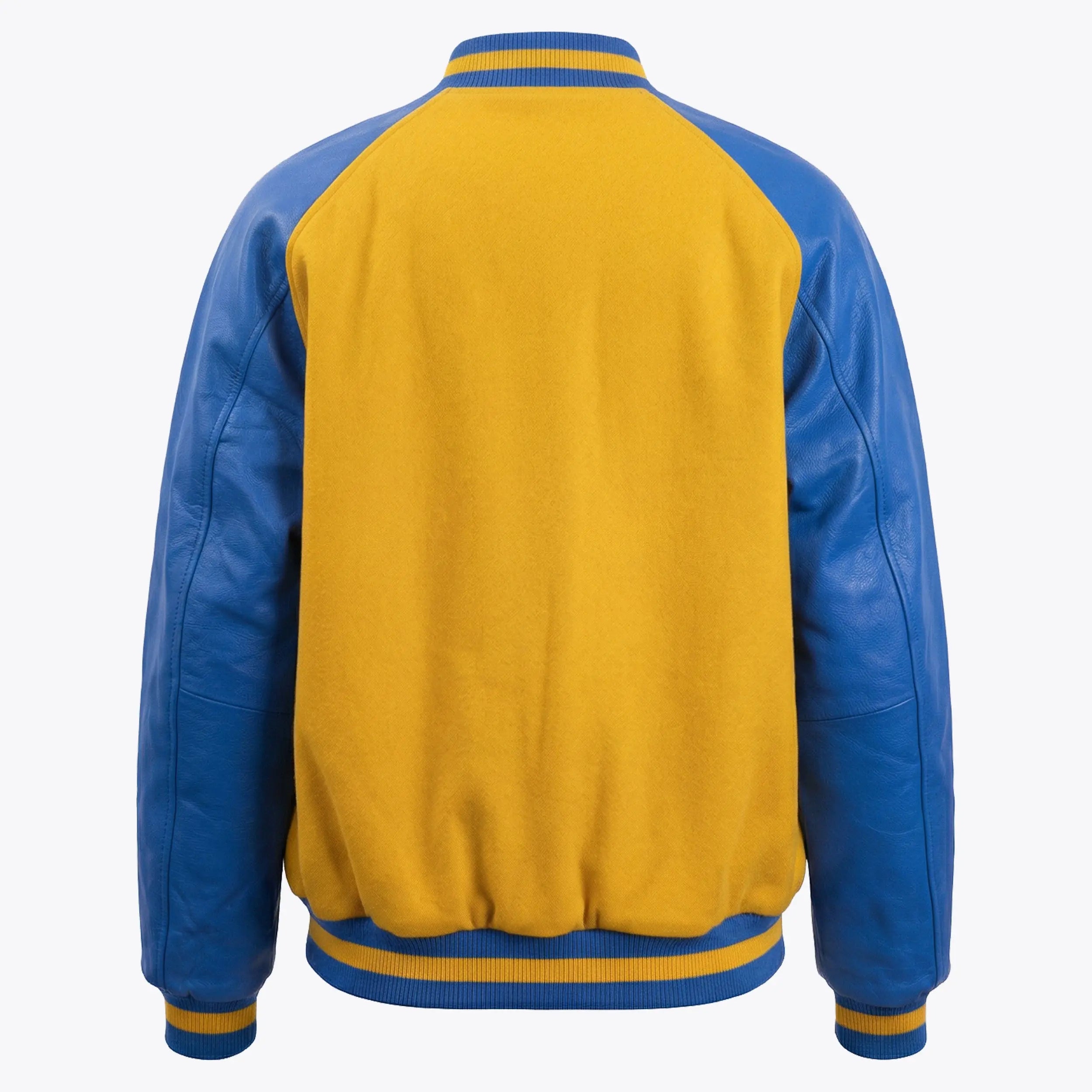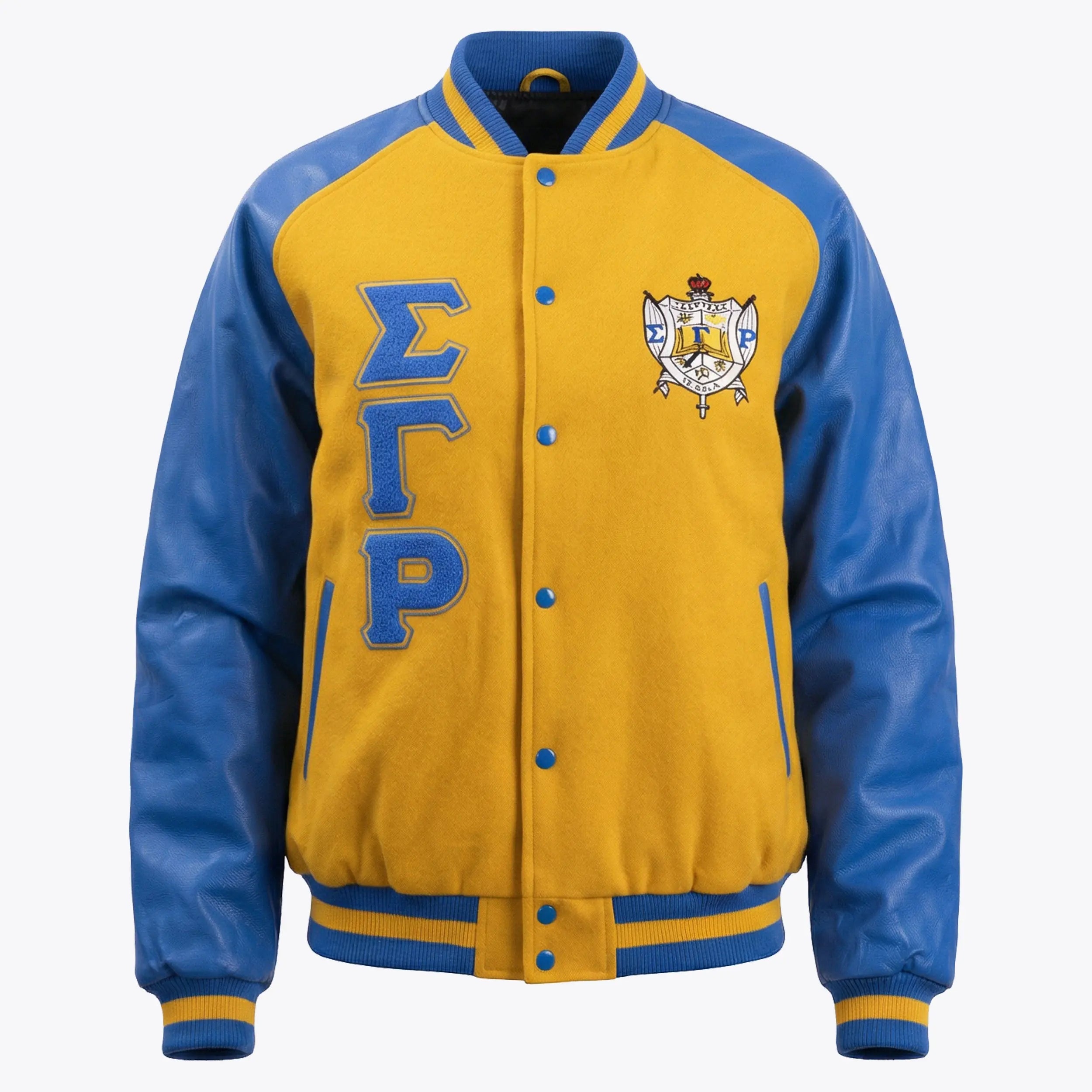 The jacket pairs a gold wool-blend body with contrasting blue leather sleeves for a traditional varsity look. Oversized Sigma Gamma Rho Greek letters run vertically on the front, while the detailed embroidered shield adds official representation. Snap-button closure and ribbed striped collar, cuffs, and waistband provide a secure, athletic fit that holds its shape.