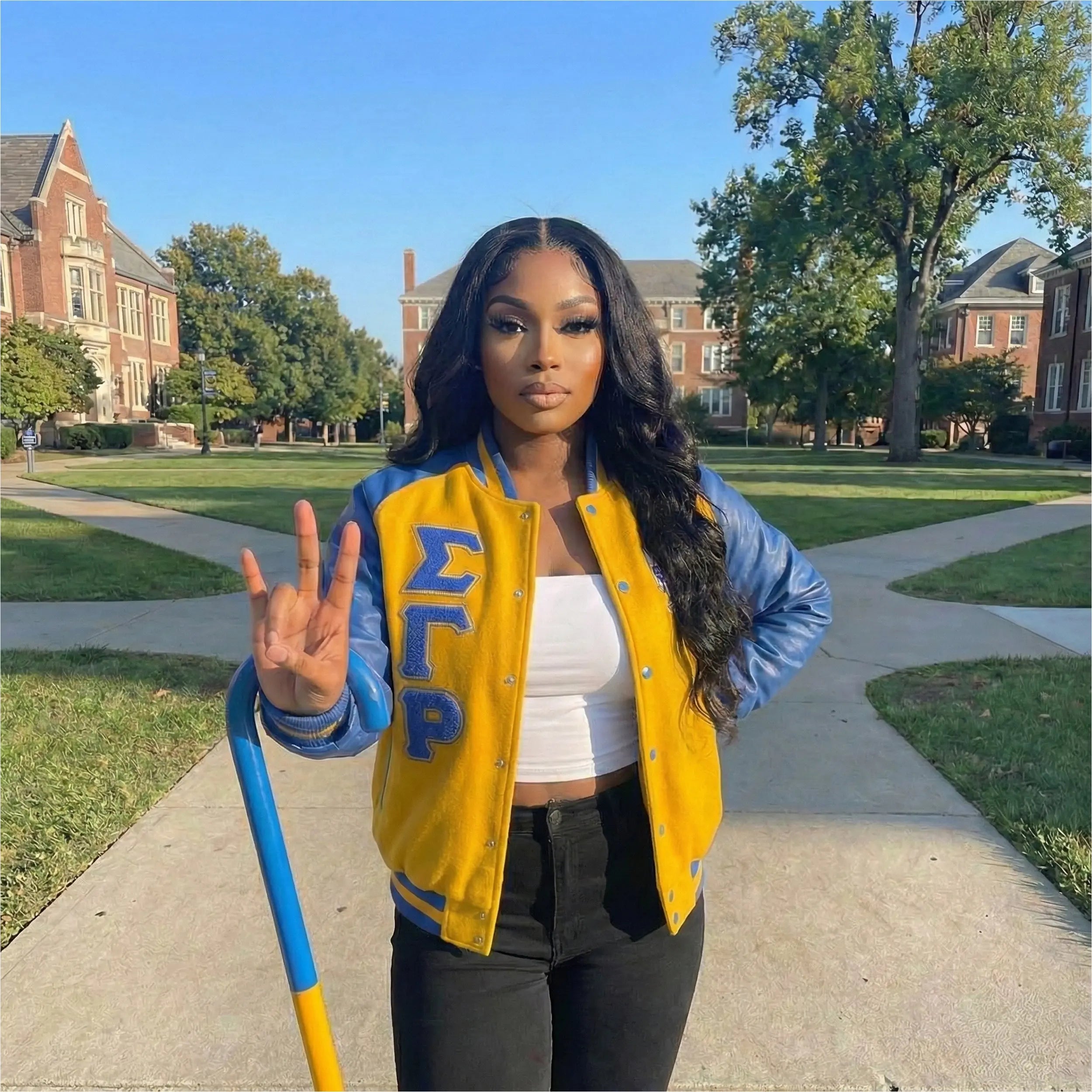 The Sigma Gamma Rho varsity jacket delivers classic collegiate style in bold royal blue and gold. Featuring large stitched Greek letters and an embroidered crest, this Sigma Gamma Rho varsity jacket is built for members who want structured, premium outerwear with strong sorority presence.