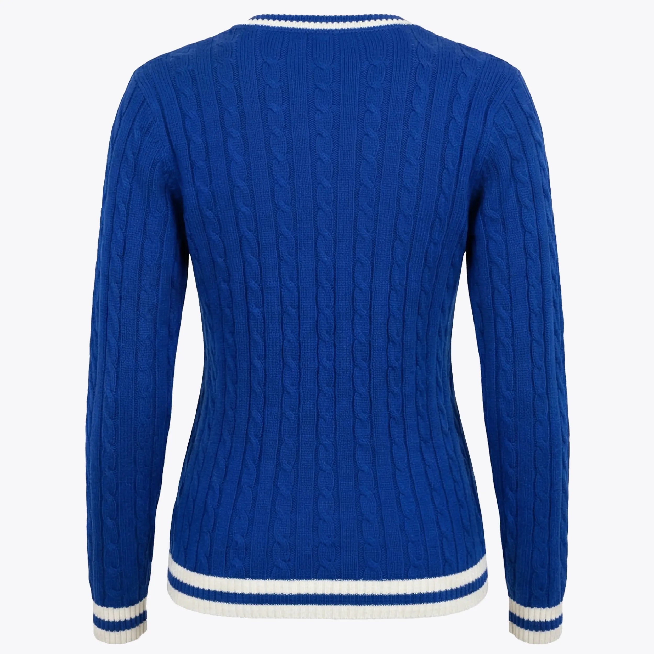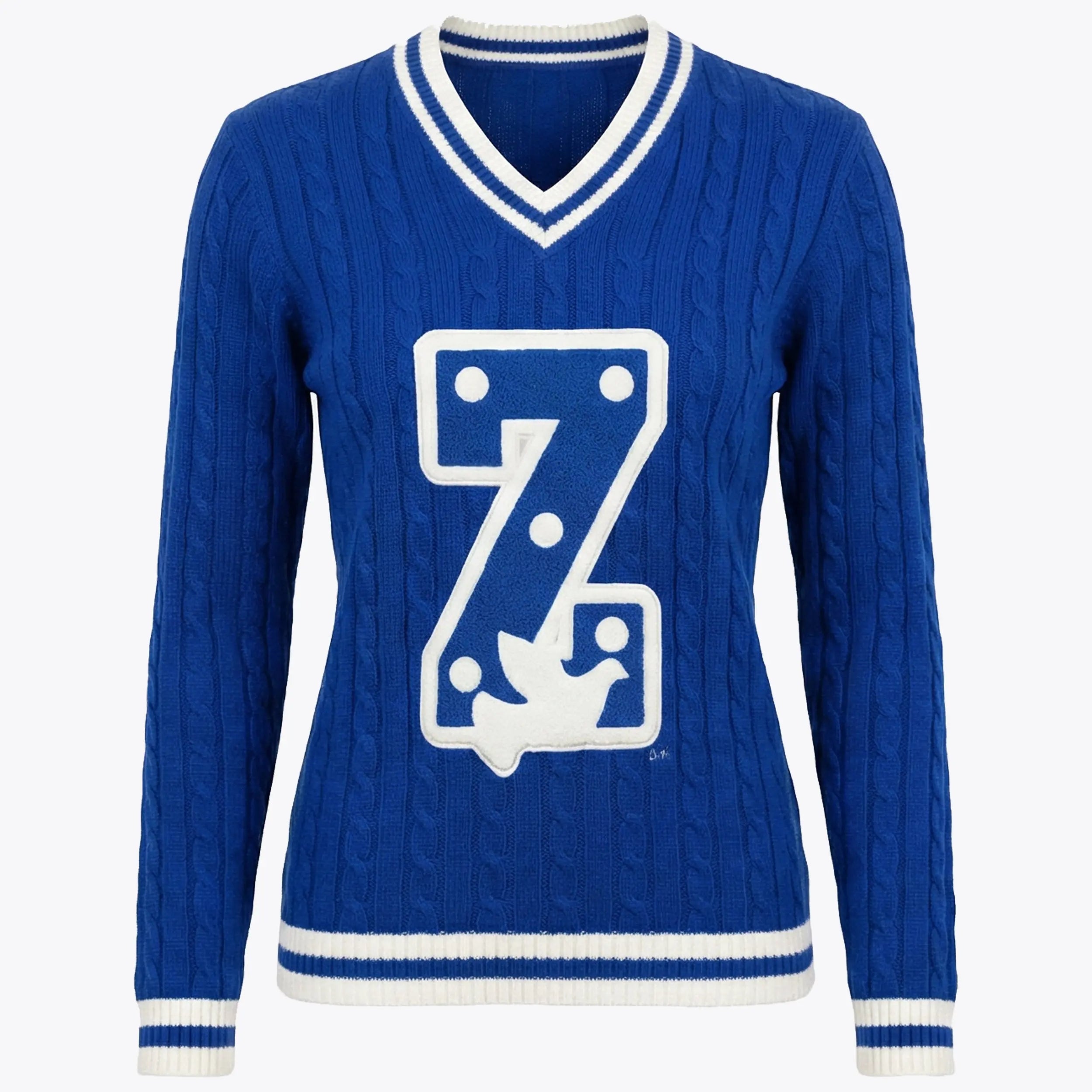 Crafted from soft, structured knit fabric, this V-neck sweater showcases an all-over cable pattern for added texture. The oversized chenille Z patch creates depth and contrast against the blue base. White stripe trim at the neckline, cuffs, and hem reinforces the collegiate aesthetic while maintaining a polished finish.